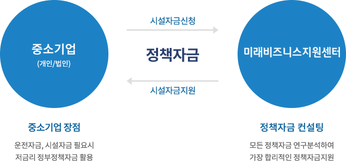 중소기업에게 지원하는 모든 종류의 정부 정책자금을 미래비즈니스지원센터에서 연구 분석하여 중소기업에게 가장 합리적인 시설자금으로 지원될 수 있도록 컨설팅하여 드립니다.